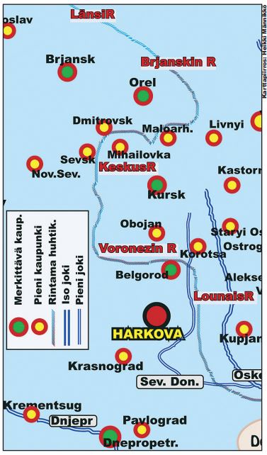 [Stalingradin taistelun jälkeen Puna-Armeijan joukkoja siirrettiin vaikeissa talviolosuhteissa pohjoisemmaksi ylemmäksi Donille. Voronezin R:n ja Brjanskin R:n väliin muodostettiin Keskus R. Vaikeissa talvi- ja kevättaisteluissa Puna-Armeija kykeni työntämään rintamalinjaa länteen lähelle linjaa Brjansk-Orel-Kursk- Belgorod-Harkova-Donetskin laakio (Piirroskartta). Myös hitleriläiset saivat kerättyä voimiaan ja suunnittelivat vastahyökkäystä mm. Harkovan lounaispuolelta ja Orelin suunnasta. Keskus R ja Voronezin R etenivä nopeasti ja pohjoisempana oleva Brjanskin R ja etelänpänä Lounais R jäivät jälkeen. Muodostui ns. Kurskin ulkonema, jonka sisään jäi huomattava määrä Neuvosto-armeijan voimia (10 armeijaa). Tämän johdosta Hitleriläisten piirissä syntyi suunnitelma iskeä Kurskin ulkoneman juureen pohjoisesta ja etelästä, muodostaa iso saarrostusoperaatio ( Zitadelle), joka toisi aloitteen jälleen fasisteille. Neuvostotiedustelulla oli tiedossa, että Saksan voimat riittävät vielä yhteen isoon yritykseen sodan suunnan kääntämiseksi. Tämä oli lähtökohta ehkä maailman suurimmalle taistelulle, Kurskin taistelulle 5.7. 1943-elokuu 1943, jossa lopullisesti ratkaistiin toisen maailmansodan ja Itärintaman taistelujen lopputulos.]