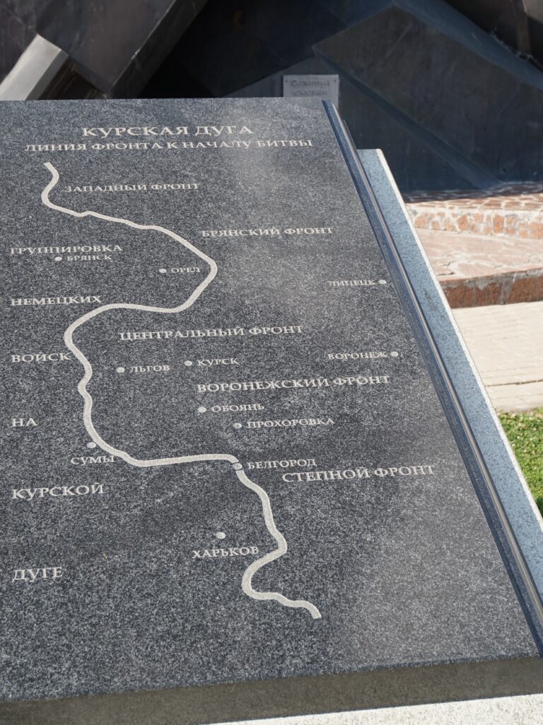 Tämä on yksityiskohta Kurskin taistelun muistoalueelta. Siinä on kiveen muotoiltuna taistelun alkutilanne. Kurskin ulkoneman keskellä sijaitsee Kursk. Ulkoneman pohjoispuolella fasistien hallitseman alueen keskellä sijaitsee Orel ja vastaavasti alueen eteläpuolella hitleriläisten hallitsemalla alueella sijaitsee Harkova. Piirriksessa näkyy jo miten neuvostojoukot olivat sijoiteltu: alhaalta lukien Aron R, Voronezin R, Keskus R, Brjanskin R ja Länsi R