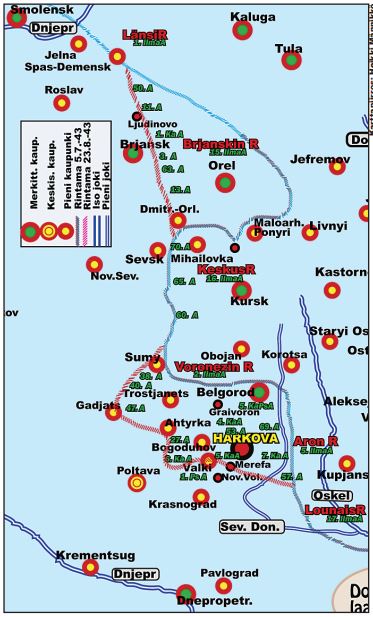 Harkovan vapauttamisen jälkeen Aron R:n joukot jatkoivat taistelua kaupungin eteläpuolella Merefan alueella. Voronežin R kykeni torjumaan Ahtyrkan vastahyökkäyksen ja asettui 25.8. linjalle Sumy – Gadjats – Ahtyrka – Konstantinovka. Molemmat rintamat saivat tehtäväkseen jatkaa hyökkäystä Dnjeprille sen keskijuoksulle. Orelin alueella kaupungin vapauttamisen jälkeen fasistit kykenivät kuljettamaan paikalle uusia voimia ja vetämään joukkonsa järjestyksessä lännemmäksi. Kolmen rintaman hyökkäys eteni hitaasti ja päättyi 18.8. Brjanskista 25 km itään linjalle Ljudinovo – Dimitrovsk – Orlovsk. Myös täällä hyökkäystä alettiin kehittää nopeasti Valko-Venäjän itäosaan ja Dnjeprille. Kurskin alueella saavutettua menestystä hyväksikäyttäen toteutettiin koko itärintamalla elosyyskuussa laajoja taistelu-operaatioita, jotka johtivat alkusyksyllä -43 mm. Donetskin laakion vapauttamiseen, Smolenskin ja Roslavin vapauttamiseen ja taistelujen siirtymiseen Valko-Venäjälle, neuvostojoukkojen etenemiseen Dnjeprille ja Desna-joelle sekä Kaukaasian lopulliseen vapauttamiseen.