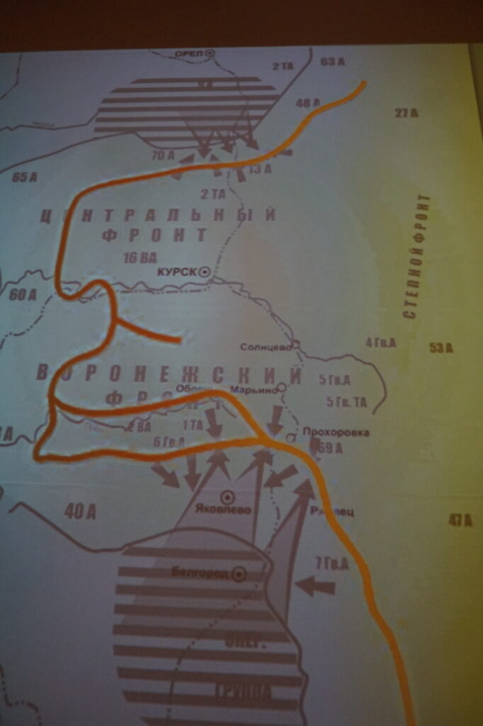 Puna-Armeijan taktiikaksi valittiin ”harkittu puolustus”. Sen mukaisesti vihollista vastaan rakennettiin useita puolustusvyöhykkeitä. Annettiin hitleriläisten hyökätä ja torjuntataisteluissa väsytettiin hyökkäävät fasistijoukot. Tämän jälkeen oikealla hetkellä reservien tukemana aloitettiin vastahyökkäys. Kuvasta selviää miten Kurskin kaaren eteläisellä osalla vetäydyttiin pitkälle Prokhorovkan ja Obojanin suuntaan pohjoisessa Kurskin suuntaan, kunnes päästiin aloittamaan vastahyökkäys.