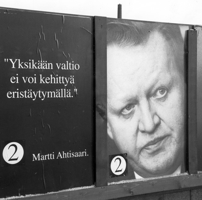 Ahtisaaren taustavoimille tuli ”hätä housuihin”, kun alkoi selvitä, että Paavo Väyrynen tulee valituksi Ahtisaaren kanssa presidentinvaalien 1994 toiselle kierrokselle. Tiedettiin, että julkisessa väittelyssä Mara ei Paavolle pärjää. Asia junailtiin siten, että tiedotusvälineet laskivat liikkeelle huhun, että nyt Elisabeth Rehn on menossa niukasti toiselle kierrokselle, mutta tarvitsee lisää ääniä. Oikeistovoimat riensivätkin äänestämään Rehniä ja Paavo saatiin syrjäytettyä. Tämän jälkeen vaalikeskusteluissa puhuttiinkin vain ”kahvikupin hinnasta”. Tämä on hyvä osoitus siitä, miten pelkän juonittelun voimin ohjaillaan ihmisten käyttäytymistä. Se on suurpääoman demokratiaa. (kuva: Heikki Männikkö)