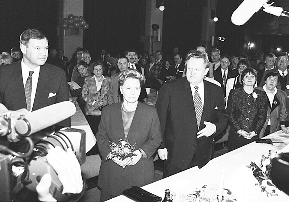 Tässä näemme riemujuhla kerrakseen. Kuvassa mm. Martti Ahtisaari ja Paavo Lipponen v. 1994 HTY:n talolla vaalivalvojaisissa juhlimassa ainakin kolminkertaista petosta, jossa (1) Ahtisaari näytteli demaria, (2) Lipponen ja SDP pettivät puoluetoverinsa ja oikeutetun presidenttiehdokkaansa Kalevi Sorsan ja (3) vetivät kadulta porvarien kannattajat SDP:n puolueäänestykseen äänestämään, äärioikeistolaisen Ahtisaaren, SDP:n presidenttiehdokkaaksi (kuva: Wikimedia commons).