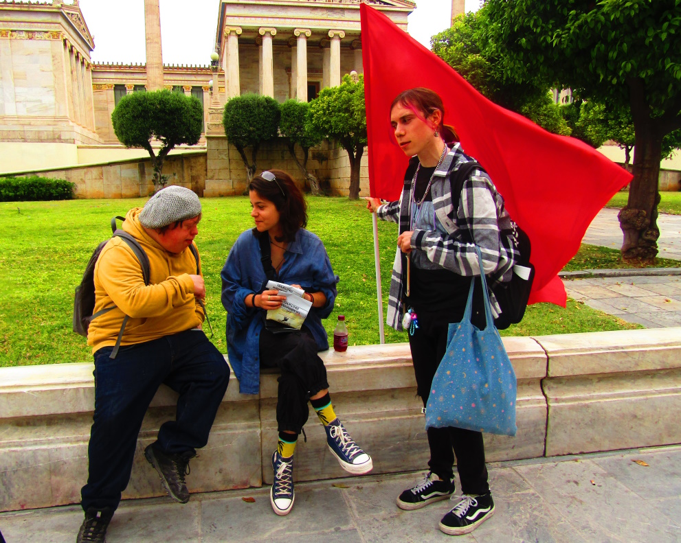 Kaduille oli viskottu yöllä lentolehtisiä. Julisteidenliimaajat olivat punanneet talojen posket vappumarssimainoksilla. Ateenassa työväen Vappu otetaan vakavasti. Kreikkalaisessa arjessa taistellaan yhä leivästä, työstä, ihmisarvosta ja yhteiskunnallisesta oikeudenmukaisuudesta. Täällä ei törötellä torvilla, eikä lakiteta pystejä tai sinkouduta simasuuna Syntagman suihkulähteisiin.
