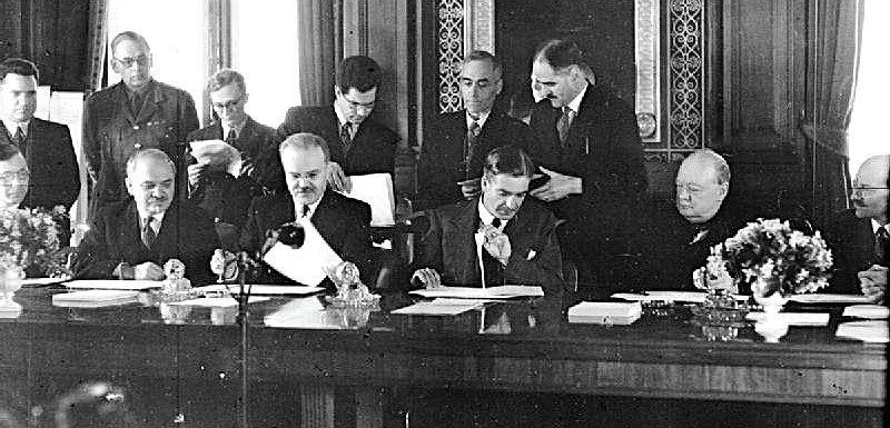 Englannin ja Neuvostoliiton allianssi solmittiin heti Saksan hyökättyä Neuvostoliittoon 12.7.1941. Kuva  allianssin allekirjoittamistilaisuudesta. Vasemmalta oikealle: Neuvostoliiton ulkoministeriön alivaltiosihteeri Sabolev, Neuvostoliiton suurlähettiläs M. Maisky, ulkoasiain kansankomissaari M. V. Molotov, Britannian ulkoministeri Anthony Eden ja pääministeri Winston Churchill. Käytännössä tällöin muodostettiin Saksan vastainen liittouma (liittoutuneet). Tällöin Ranska ei vielä ollut mukana, koska se oli miehitetty ja USA ei ollut vielä mukana sodassa. (Kuva Wikimedia Commons)