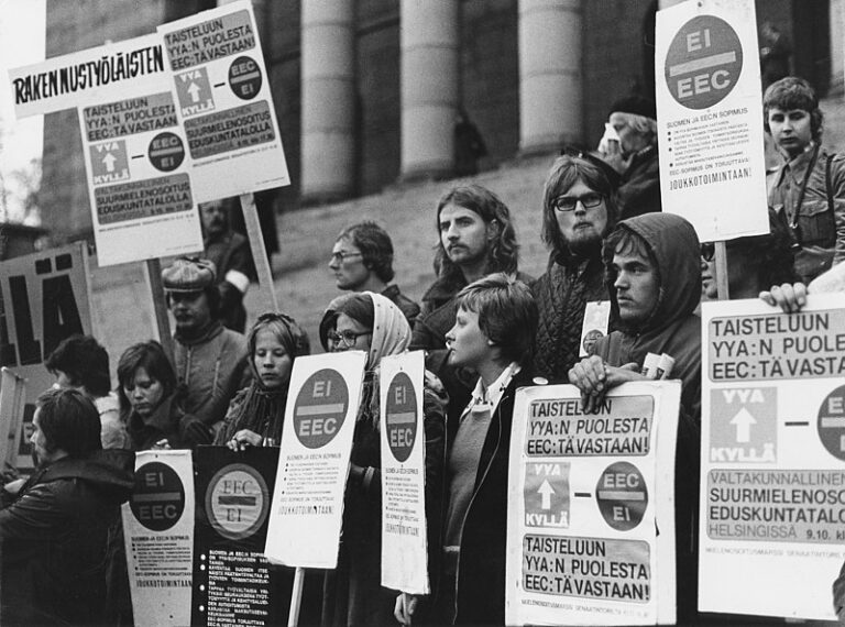 Eduskuntatalolla v. 1973 protesti EEC:a vastaan. Jo silloin ymmärrettiin EEC:n keskeinen funktio, kun vaadittiin YYA:n puolesta EEC:a vastaan. Kaikki ne pelot, joista silloin varoitettiin, ovat toteutuneet (Kuva CC BY 4.0 DEED).
