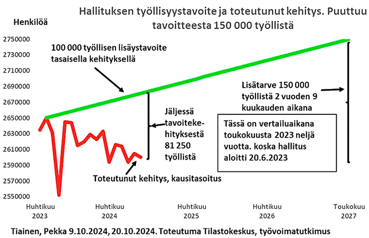 Uusi hallitus aloitti kesäkuussa 20.6.2023. Hallituksen työllisyys- tavoitteesta 100 000 lisätyöllistä puuttui elokuussa 2024 150 000 työllistä. Tämä lisäys olisi saatava aikaan kahden vuoden yhdeksän kuukauden aikana. Kuvio kertoo luvut ja havainnollistaa asian. Jälkeenjääminen tasaisesta kehityksestä oli elokuussa 81 250 työllistä. Tämä johtuu työllisyyden alamäestä lisäyksen sijasta. Tähänastisessa kehityksessä olennainen kysymys on, (1) kuinka paljon heikko taloudellinen kehitys, (2) kuinka paljon valtion menojen leikkaukset ja (3) kuinka paljon saman aikainen korkea korko ovat vaikuttaneet työllisyyden alamäkeen.