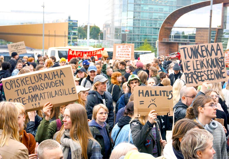 Ay-liike, opiskelijat, työttömät ovat joutuneet syksyn edetessä turvautumaan erilaisiin työtaistelukeinoihin ja protestoivat 5.10.2023 elämisen kalleutta ja leikkauksia vastaan. Orpon kopla uhkailee toimeentuloon ja perusturvaan kovia heikennyksiä. Uhataan poistaa TES:n yleissitovuus. Lakko-oikeutta pyritään rajoittamaan mm. lakkosakkoja korottamalla. Ansiosidonnaisen työttömyysturvan työssäoloehto yritetään nostaa 12 kuukauteen. Hyvinvointialueiden säästöt vaaditaan 1,4 mrd. Äärioikeisto pyrkii poliittiseen muutoksen ay-liikeen ja kansanliikkeiden toiminnan mitätöimiseen. Opiskelijat totesivat leikkauksilla olevan ideologiset tavoitteet. (Kuva Heikki Männikkö)