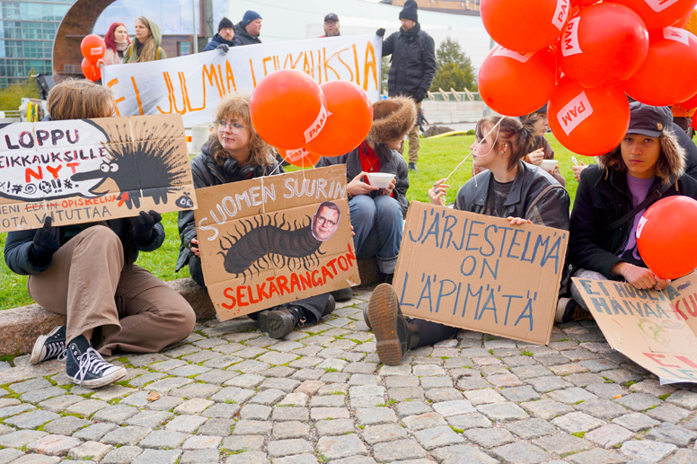 Ay-liikkeen ja eri etujärjestöjen (PAM, JHL, opiskelijat, työttömät) hallituksen suunnittelemien leikkausten vastaiset protestit jatkuivat Eduskuntatalolla 12.10.2023. Äärioikeiston hallitusta vaadittiin luopumaan leikkauksista ja Sote-palvelujen yksityistämisestä (Kuva Heikki Männikkö)