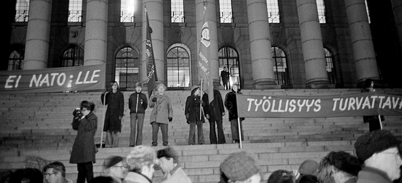 Eduskuntatalolla v. 1973 protesti EEC:a vastaan. Jo silloin ymmärrettiin EEC:n keskeinen funktio, kun vaadittiin YYA:n puolesta EEC:a vastaan. Tänään sekä talouspolitiikka, että turvallisuuspolitiikka osoittavat, että kaikki ne pelot, joista silloin varoitettiin, ovat toteutuneet. Nato ja EEC:n seuraaja EU vaarantavat maamme talouskehityksen ja turvallisuuden (Kuva CC BY 4.0 DEED).