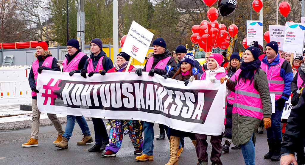 Vuodenvaihteessa 2023-24 palkansaajajärjestöt kamppailivat torjuakseen hallituksen aikeet mm. isoista leikkauksista ja lakko-oikeuden kaventamisesta. Ulkopoliittisesta painostuksesta johtuen palkansaajat pakotettiin lopettamaan lakkoilu. Kaksi vuotta sitten Orpon-Purran-Satosen toimien vastainen kampanja lopetettiin kuin kanan lento. Nyt ilman vastarintaa hallitus toteutti haaveensa poistamalla Ay-jäsenmaksujen verovähennysoikeuden. Tämä on jo selkeästi johtanut Ay-järjestäytymisen heikkenemiseen. (Kuva: Heikki Männikkö; STTK:n järjestöjen protesti hallituksen heikennyksiä vastaan 18.11.2023)