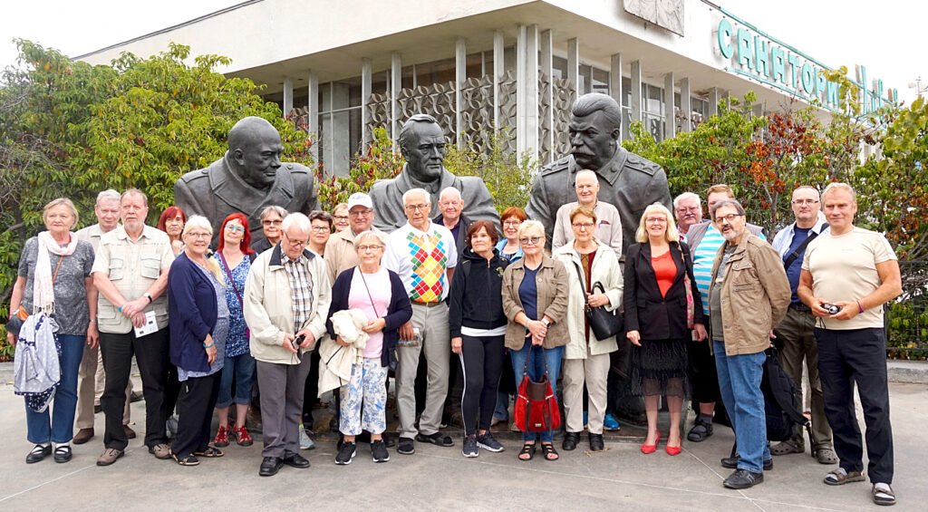 Osaston toimesta on harrastettu vuosikymmenten ajan Venäjän matkailua. Ikimuistettava matka muiden ikimuistettavien ohella oli ennen pandemiaa tehty matka Krimille. Kuvassa ryhmän jäsenet ovat kokoontuneina Livadian palatsille, jossa pidettiin liittoutuneiden Jaltan konferenssi. Taustalla silloisia kokoukseen osallistuneita maailmanhistorian merkkihenkilöitä (Roosevelt, Churchill ja Stalin) kuvaavava monumentti.