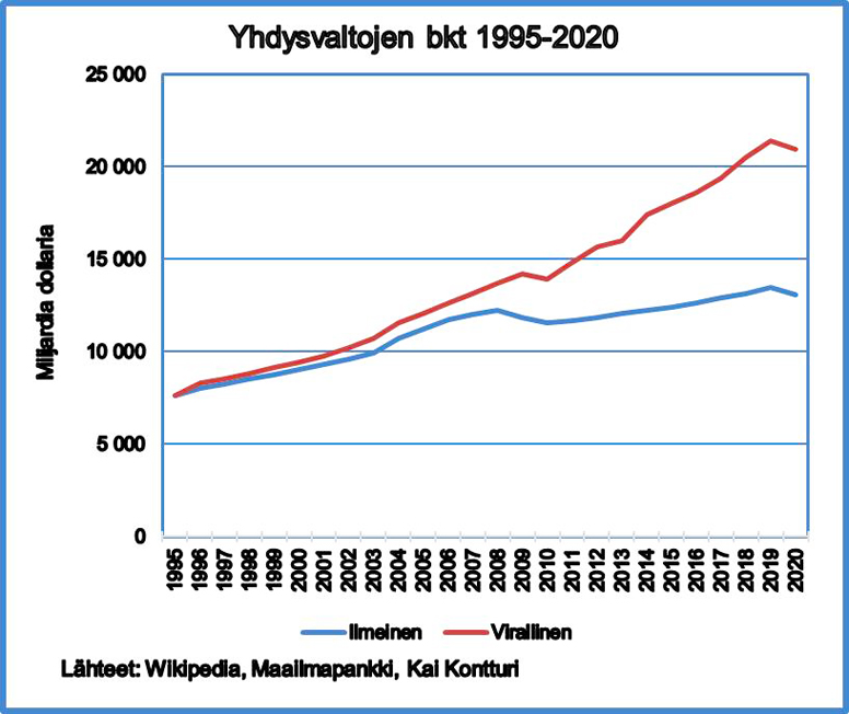 Useiden arvioiden mukaan Yhdysvaltojen bkt:n keskimääräinen kasvu olisi kuitenkin ollut vain 2,2–2,5 prosenttia vuodessa. Vuosittaisen seurantani mukaan todellinen keskimääräinen vuosikasvu olisi noin 2,8 prosenttia ja vuoden 2020 ilmeinen bkt:n summa 13 079 miljardia dollaria. Lienee sanomattakin selvää, että kumpikaan näistä ei ole täsmällisinä lopullinen tieto. Toisaalta sillä tuskin on edes suurta merkitystä, sillä oleellista on, kumpi on lähempänä totuutta ja kuvastaa paremmin tilannetta Yhdysvalloissa.