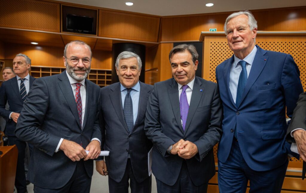 Kuva keskustaoikeistolaisen Euroopan kansanpuolueen edustajakokouksesta13.-14 marraskuuta 2023. Michel Barnier oikealla. Macron lykkäsi vaalien jälkeen hallitusneuvotteluja pari kuukautta ja nimitti lopulta pääministeriksi entisen EU-komissaarin Michel Barnierin, joka edustaa oikeiston republikaaneja. EU:n parlamentissa LR kuuluu samaan ryhmään mm. Saksan kristillisdemokraattien- ja Suomen kokoomuksen kanssa (Euroopan kansanpuolue). Barnierin hallitusohjelma on täysin vastaava kuin meillä Orpon ohjelma.