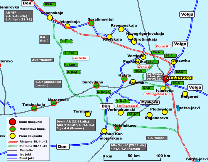 Kuva. 80 vuotta sitten käytiin Stalingradissa ratkaisevia taisteluja. Kuvassa näkyy rintamalinja juuri ennen vastahyökkäystä 19.11.-42 (pun. varjoviiva) ja 30.11.-42 (vihr. varjoviiva). Hyökkäys eteni suunnitellusti. Saartorengas suljettiin 23.11. Donin R:n 21., 65., 24. ja 66.A kiristivät saartorengasta pohjoisesta ja lännestä sekä Stalingradin R:n 57.-, 64.- ja 62.A etelästä ja idästä. LounaisR:n 5.PsA ja 1.KaA laajensivat ulompaa saartorintamaa Kantemirovkan-Millerovon suuntaan ja Stalingradin R:n 51.A Kotelnikovon suuntaan. Tilanne muuttui joulukuussa fasistien yrittäessä Kotelnikovon-Tormosinin suunnasta murtaa käytävää saarrettujen fasistijoukkojen luokse. Stalingradin R sai vahvennuksekseen 2.KaA:n ja 5.IskuA:n. LounaisR:n hyökkäyssuunta käännettiin joulukuussa Tatsinskajan-Morozovskin suuntaan Mansteinin joukkojen selkään. Rintama sai avukseen uuden 3.KaA:n ja Voronezin rintaman 6.A:n. Ratkaisevia taisteluja käytiin mm. joulun ja uudenvuoden välillä -42. Puna-armeija kykeni tuhoamaan tieltään huomattavan osan vihollisjoukoista, ja vuoden loppuun mennessä rintamalinja oli siirtynyt 200-250 km länteen ja lounaaseen.