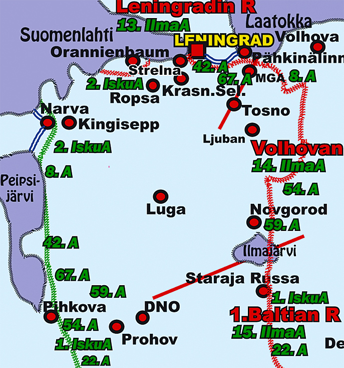 Karttapiirroksesta selvinnee taistelujen kulku Leningradin alueen vapauttamisoperaatiossa: rintamalinja (punainen linja) osoittaa armeijoiden sijainnit 14.1.-44 sekä rintamalinja (vihreä linja) ja armeijoiden sijainnit 1.3.-44. Punaiset suorat viivat ilmaisevat rintamakaistojen sijainnit. Tilanne tällä alueella pysyi tämän jälkeen ennallaan heinäkuun alkuun saakka. Siihen mennessä käytiin mm. taistelut Krimin ja Ukrainan vapauttamiseksi ja aloitettiin taistelut Valko-Venäjän vapauttamiseksi sekä suomalaisten karkottamiseksi Kannakselta ja Itä-Karjalasta. (Piirros Heikki Männikkö)