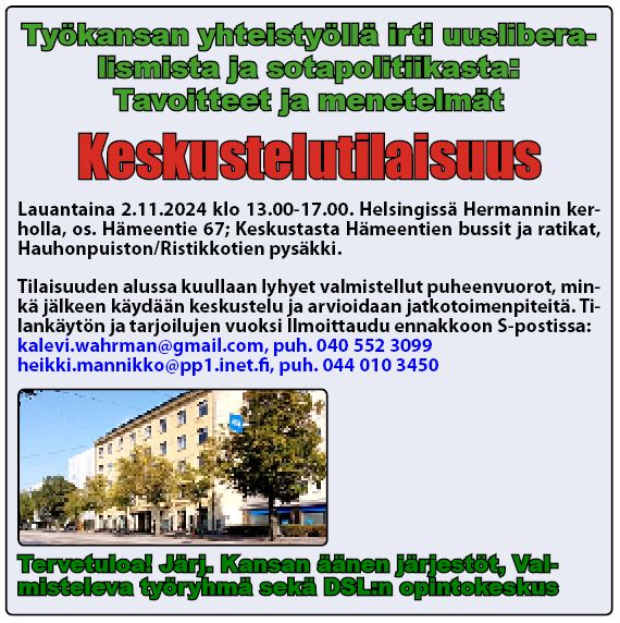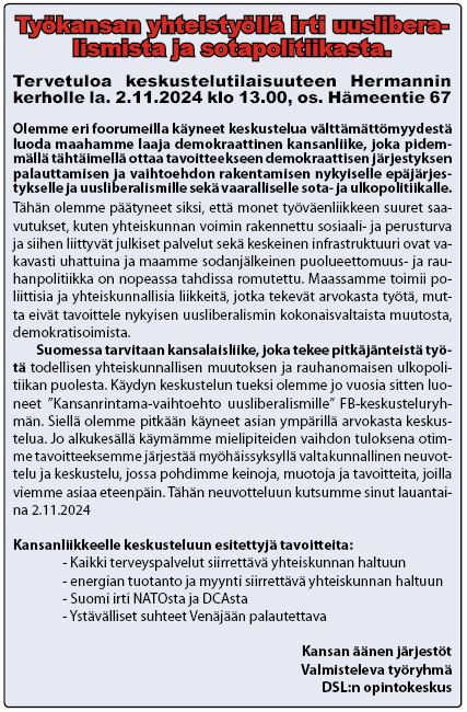 Suomessa tarvitaan kansalaisliike, joka tekee pitkäjänteistä työtä todellisen yhteiskunnallisen muutoksen ja rauhanomaisen ulkopolitiikan puolesta. Käydyn keskustelun tueksi olemme jo vuosia sitten luoneet ”Kansanrintama-vaihtoehto uusliberalismille” FB-keskusteluryhmän. Siellä olemme pitkään käyneet asian ympärillä arvokasta keskustelua. Jo alkukesällä käymämme mielipiteiden vaihdon tuloksena otimme tavoitteeksemme järjestää myöhäissyksyllä valtakunnallinen neuvottelu ja keskustelu, jossa pohdimme keinoja, muotoja ja tavoitteita, joilla viemme asiaa­ eteenpäin. Tähän neuvotteluun kutsumme sinut lauantaina 2.11.2024