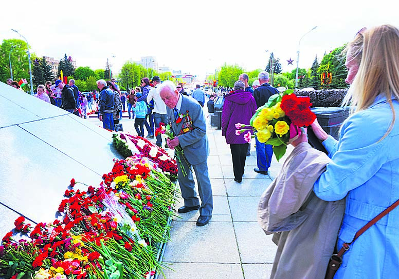 Voiton aukiolla ihmiset tapaavat Voitonpäivänä. Aukiolla sijaitsevalle 38 m korkealle monumentille ihmiset tuovat kukkia. Veteraani laskee kukkia kaatuneiden taistelutovereidensa muistoksi. (Kuva: Heikki Männikkö)