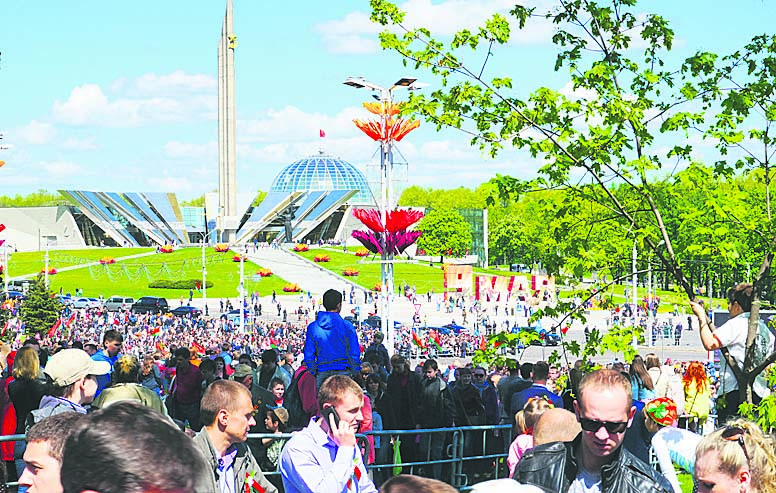 Voitonpäivän paraatia seuraavan ihmisjoukon takana puistossa näkyy uusi Toisen Maailmansodan museo. Puiston edestä kulkee Prospekt Pjatra Masherava, jossa sotilasparaati pidetään. paraatia seurasi miljoona ihmistä. (Kuva: Heikki Männikkö)