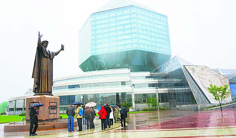 Tutustuimme Valko-Venäjän kansalliskirjastoon. Se perustettiin jo vuonna 1922. Nykyinen kirjastorakennus rakennettiin vuosina 2002 2006. Kirjastorakennuksen arkkitehtuuri heijastelee hyvinkin Minskin uutta rakennuskulttuuria. Kirjaston kokoelmissa on 9 miljoonaa nidettä. Sen lisäksi, että kirjastossa on runsaasti lukusaleja, näyttelytiloja ym., sinne on sijoitettu myös kansainvälisiä poliittisia tapaamisia varten neuvottelu ja kongressikeskus.