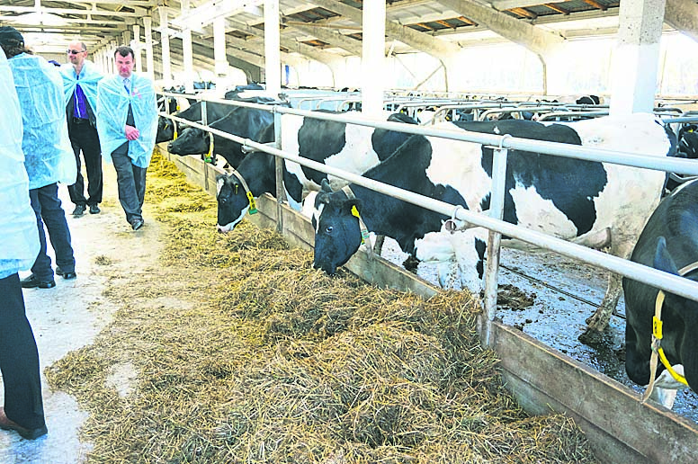 Tilalla oli 1700 lehmää. Navetat olivat pihattoja, joissa lehmät halutessaan pääsivät ulkotilaan. Lypsy oli automatisoitu. Kun ”vanhaan aikaan” tilalla yksi lypsäjä lypsi päivittäin 22 lehmää, niin tänään kone lypsää päivässä 740 lehmää. Sitä emme osanneet kysyä, että löytyikö kaikille työikäisille lypsäjille uusi työpaikka? Keskilypsy tilalla oli 18,9 kg/vrk. Suomessa vastaava luku tällä hetkellä on n. 22 kg. Mielenkiintoinen oli tilan omistajapohja. Valtio omistaa 50 % ja omistusosuuskunta 50 %. Useat omistusosuuskunnan jäsenet myös työskentelevät tilalla. Käytäntö osoittaa, että tällä omistuspohjalla maataloustuotanto toimii menestyksellisesti.