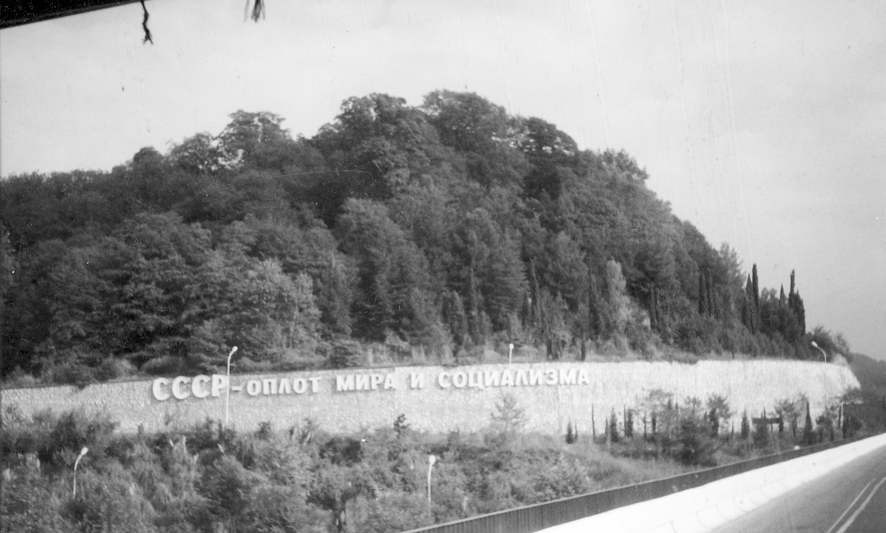 huiput. Etualalla näkyy Georgiasta irtaantuneen Abhasian lippu. Sen tunnus – kämmen – tarkoittaa ”tervetuloa.” Ympäsillä seitsemän tähteä kuvaavat Abhasian seitsemää aluetta. Vihreä ja valkoinen kuvaavat kristinuskon ja islamin liittoa. (Kuva Tarja Männikkö)