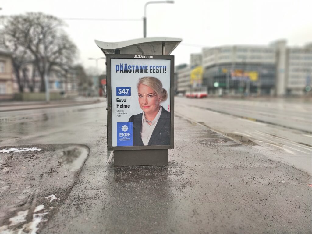 EKRE:n puheenjohtaja Martin Helmen vaimo Eeva Helme on myös ehdolla sunnuntain vaaleissa. Oikeistolainen EKRE, katsoo, ettei Ukrainan sota ole Viron sota. He vastustavat aseapua Ukrainalle. (Kuva: Leena Hietanen)